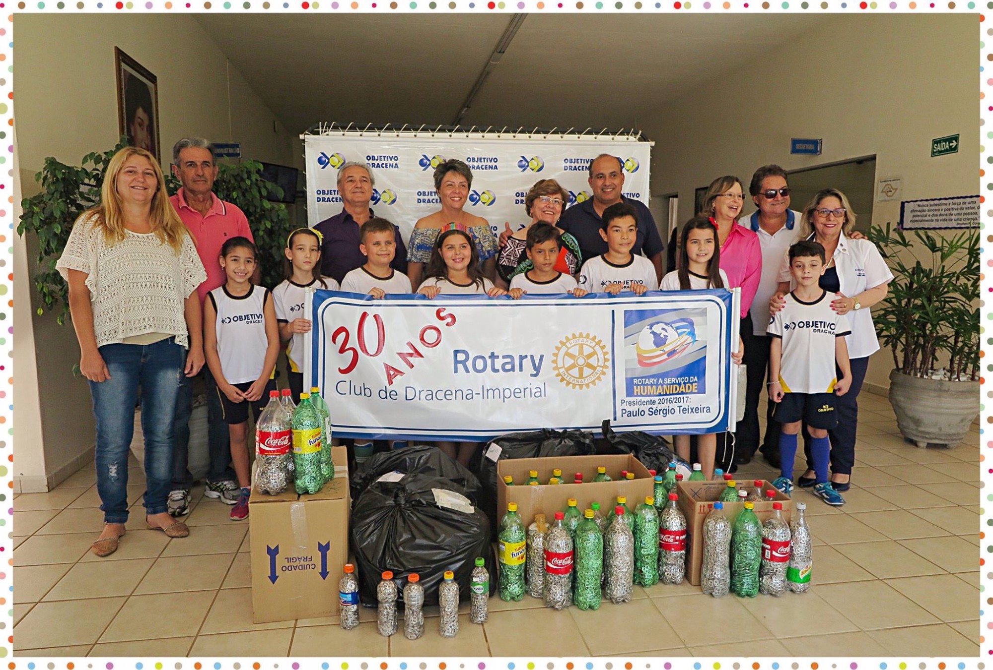 O Rotary Club de Dracena Imperial, mais uma vez sensibilizado e muitíssimo agradecido, comparece ao Colégio Objetivo de Dracena, para receber das mãos da Diretora Sra. Luzilena Carvalho Botazzo, das dedicadas professoras e queridos e generosos alunos, os lacres das latas de refrigerantes...A venda desses lacres, nos permitem adquirir as "Cadeiras de Rodas" com as quais, o Rotary Club de Dracena Imperial, oportunamente atende aos pedidos da comunidade. ..Muito obrigado à todos os envolvidos na causa.